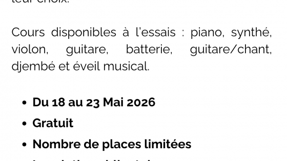 https://al.ecolebouvron.org/wp-content/uploads/sites/4/2026/04/cours-essai-flyer-2026-724x1024.png 724 1024 Amicale Laïque de Bouvron Amicale Laïque de Bouvron https://al.ecolebouvron.org/wp-content/uploads/sites/4/2026/04/cours-essai-flyer-2026-724x1024.pngLes portes ouvertes et mini-auditions se dérouleront du 18 au 23 mai 2026. Cet événement est une occasion unique pour les élèves et les passionnés de musique de découvrir les différents instruments et cours proposés par notre école. Après une première expérience l’année dernière, le Bureau de La Minote ainsi que les professeurs de musique ont souhaité réitérer…