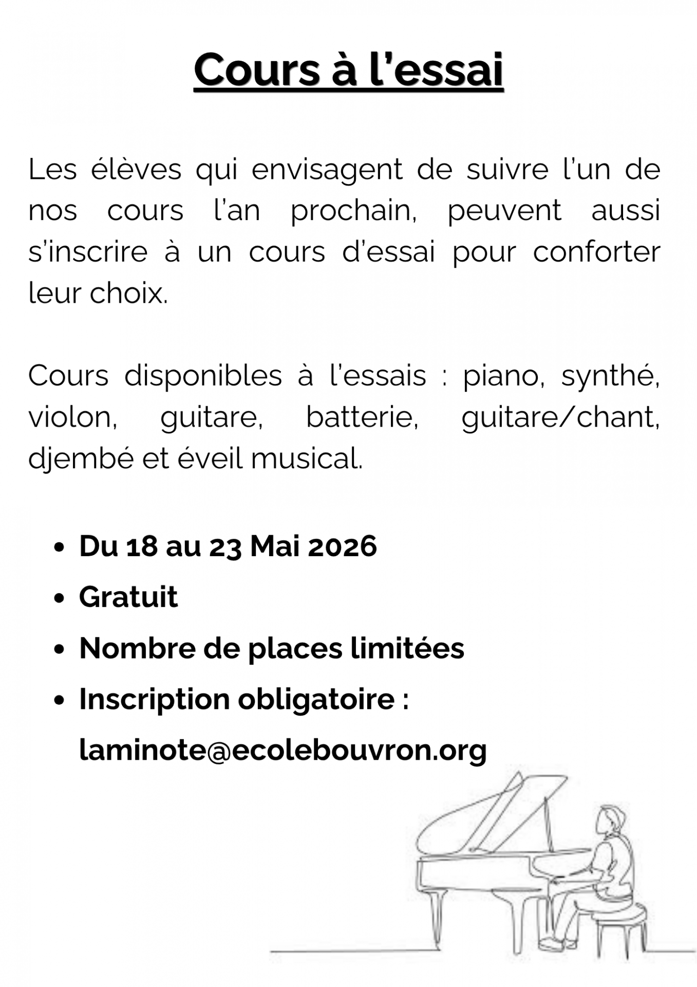Le nombre de places est limité par instrument, donc l’inscription est obligatoire. Pour vous inscrire, veuillez envoyer un mail à l’adresse suivante : laminote@ecolebouvron.org.